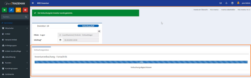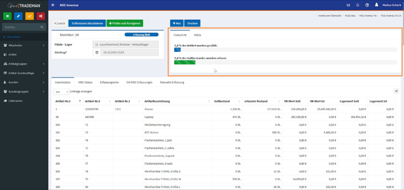 Sobald Zählungen vorliegen, zeigt TRADEMAN automatisch den Fortschritt Ihrer Inventur an.