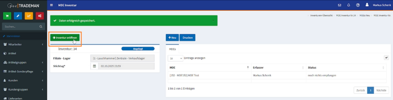 Zurück in TRADEMAN: Über den Menüpunkt „Inventur eröffnen“ gelangen Sie in die Ansicht, in der Artikel angezeigt werden.