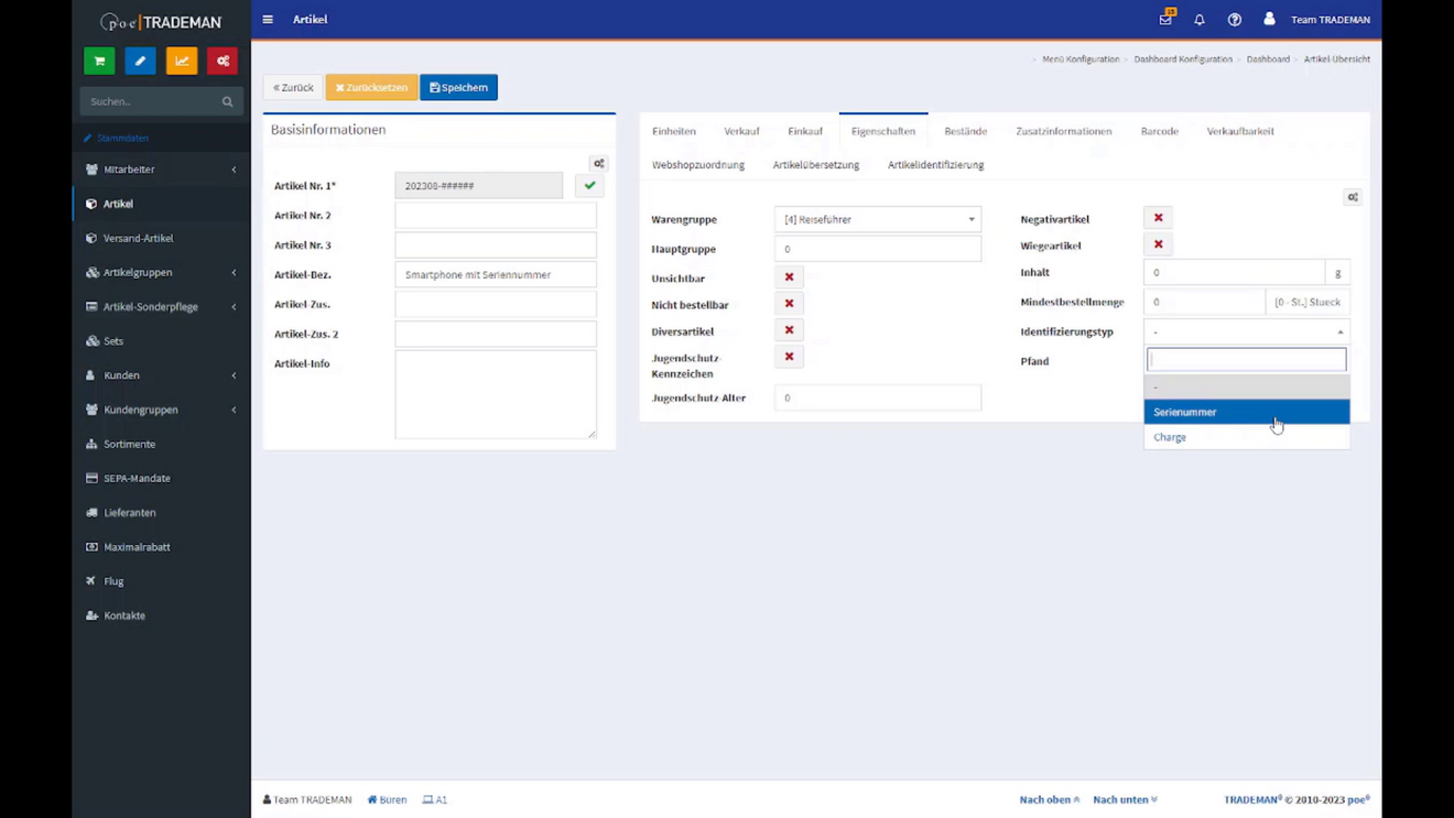 Wenn du Artikel verkaufen möchtest, die über eine eindeutige Seriennummer verfügen, kannst du diese nun in deiner TRADEMAN Warenwirtschaft anlegen. Zum Anlegen eines Artikels mit Seriennummer gehst du wie gewohnt vor. Unter Stammdaten → Artikel → Neu kannst du einen neuen Artikel anlegen. Unter dem Reiter Eigenschaften kannst du nun definieren, dass der Artikel ein Seriennummern-Artikel ist (Identifizierungstyp = Seriennummer).